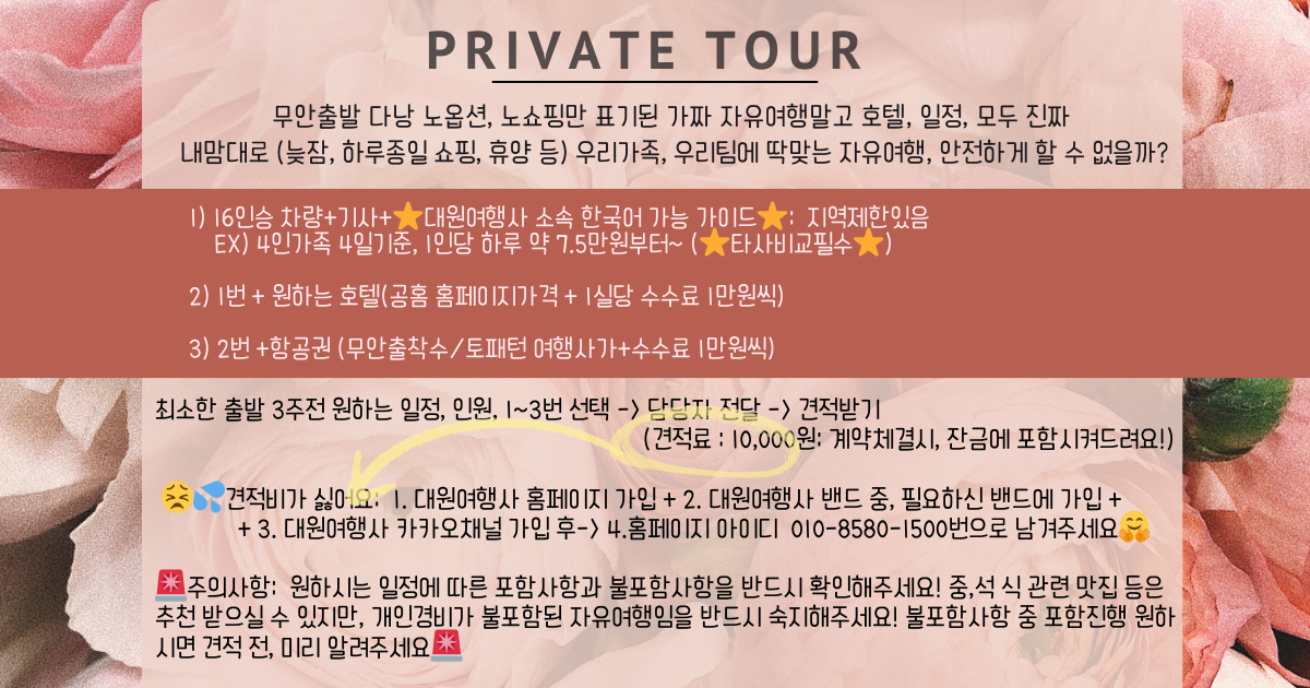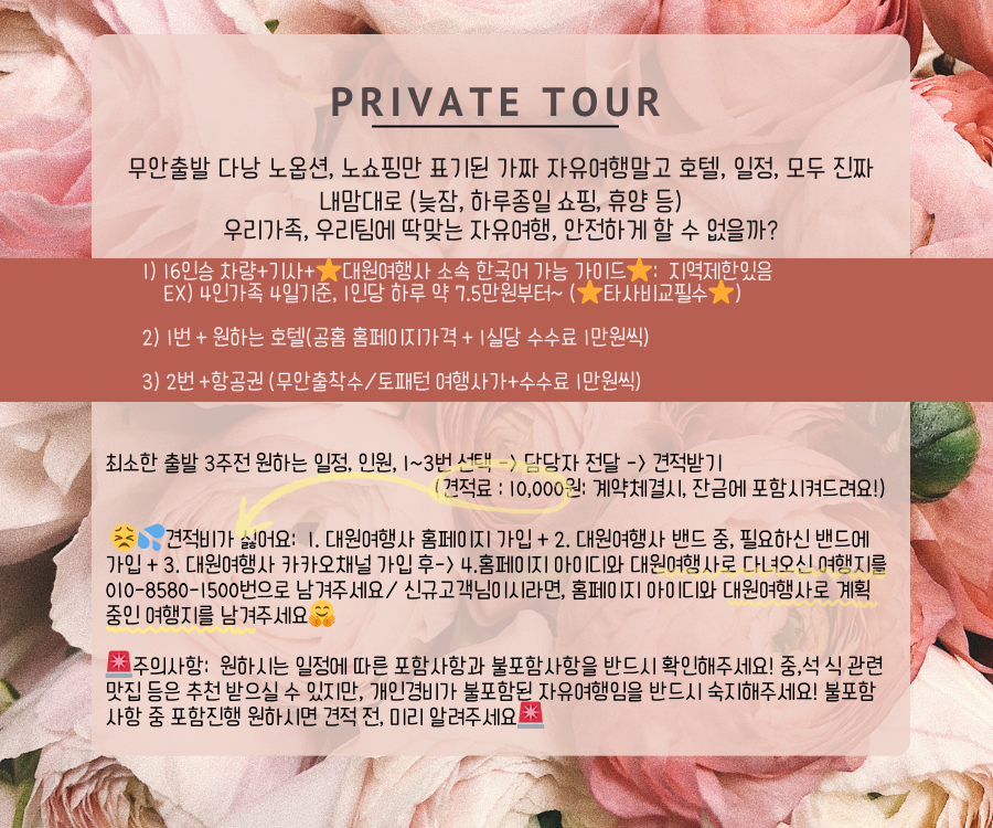 마지막 필독 사항!🧡 원하시는 호텔의 급수와, 루트, 음식, 음료 등까지 포함된 대략적 부가비용의 견적을 원하실 경우에는 소량의 견적비를 받습니다. 다만 계약이 체결될 경우에는 잔금에 포함시켜드립니다.